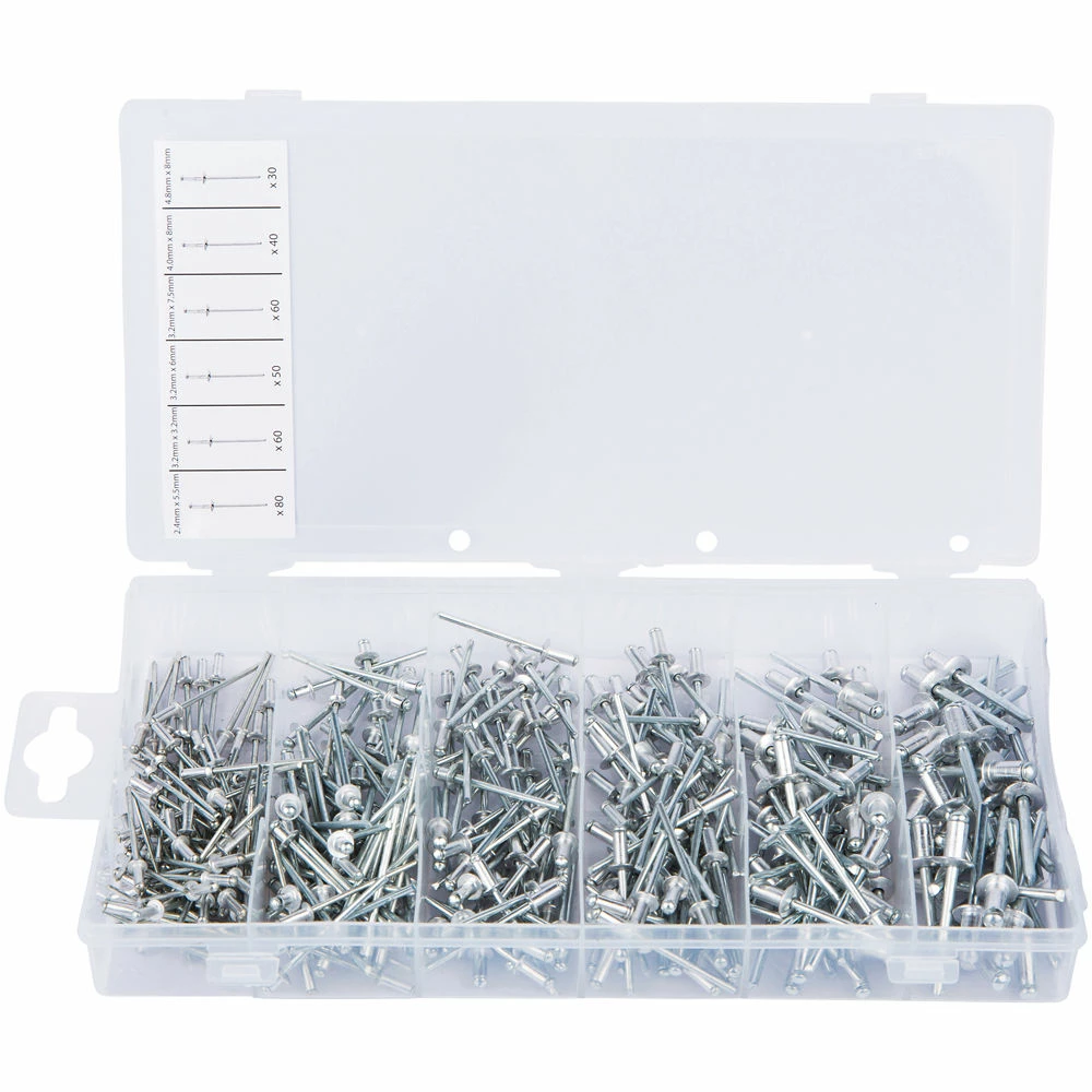 This 320 piece Assorted Rivet set is suitable for use with most air and hand riveters. It includes a carrying case for quick and convenient storage.