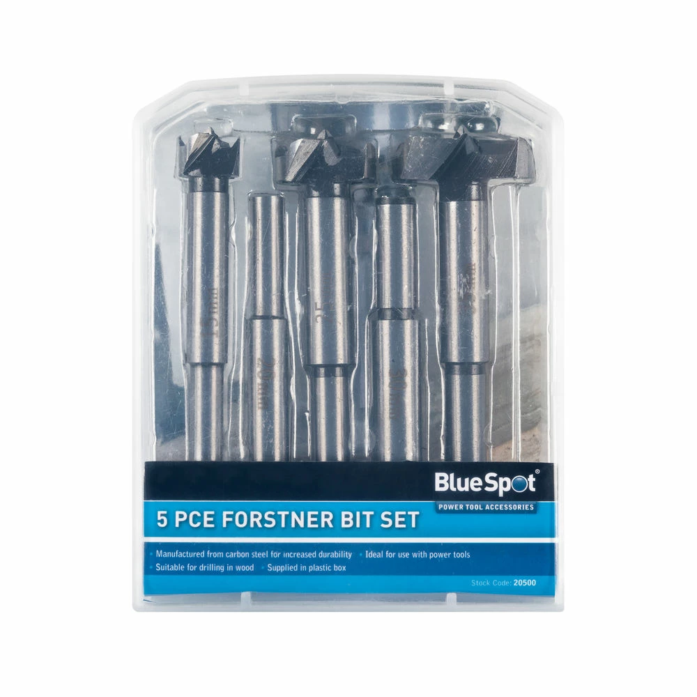 This 5 Piece Metric Hinge/Forstner Bit Set is made from heat treated steel for strength and precision. Ideal for drilling flat bottom holes into wood, the sharp cutting edge reduces chips and ensures clean finish. Will fit all types of drill. Complete with plastic storage box..