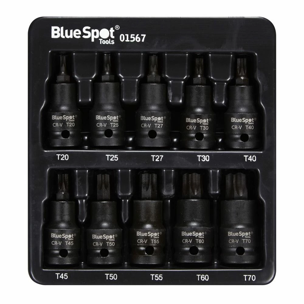 The BlueSpot 10-piece 1/2″ Impact Torx Bit Set are ideal for use with 1/2″ tools. The sockets are manufactured from heat treated chrome vanadium for increased durability. The bits are manufactured from heat treated S2 steel.
