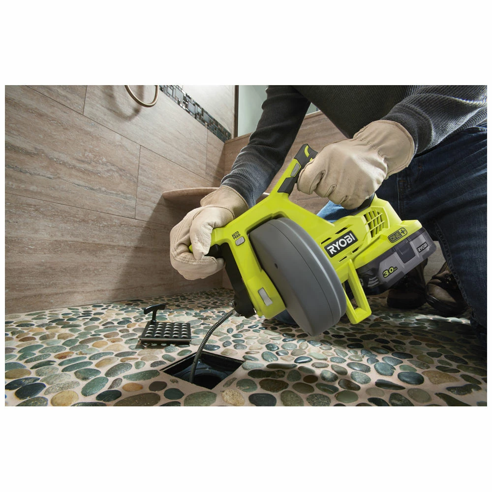The Ryobi R18DA-0 Cordless Drain Auger is ideal for cleaning and unblocking household drains. The 7.6m reinforced cable minimises kinking and can clear drains up to 50mm thick. The powered feed dispenses the cable quickly at 11.5cm a second either forwards of backwards.