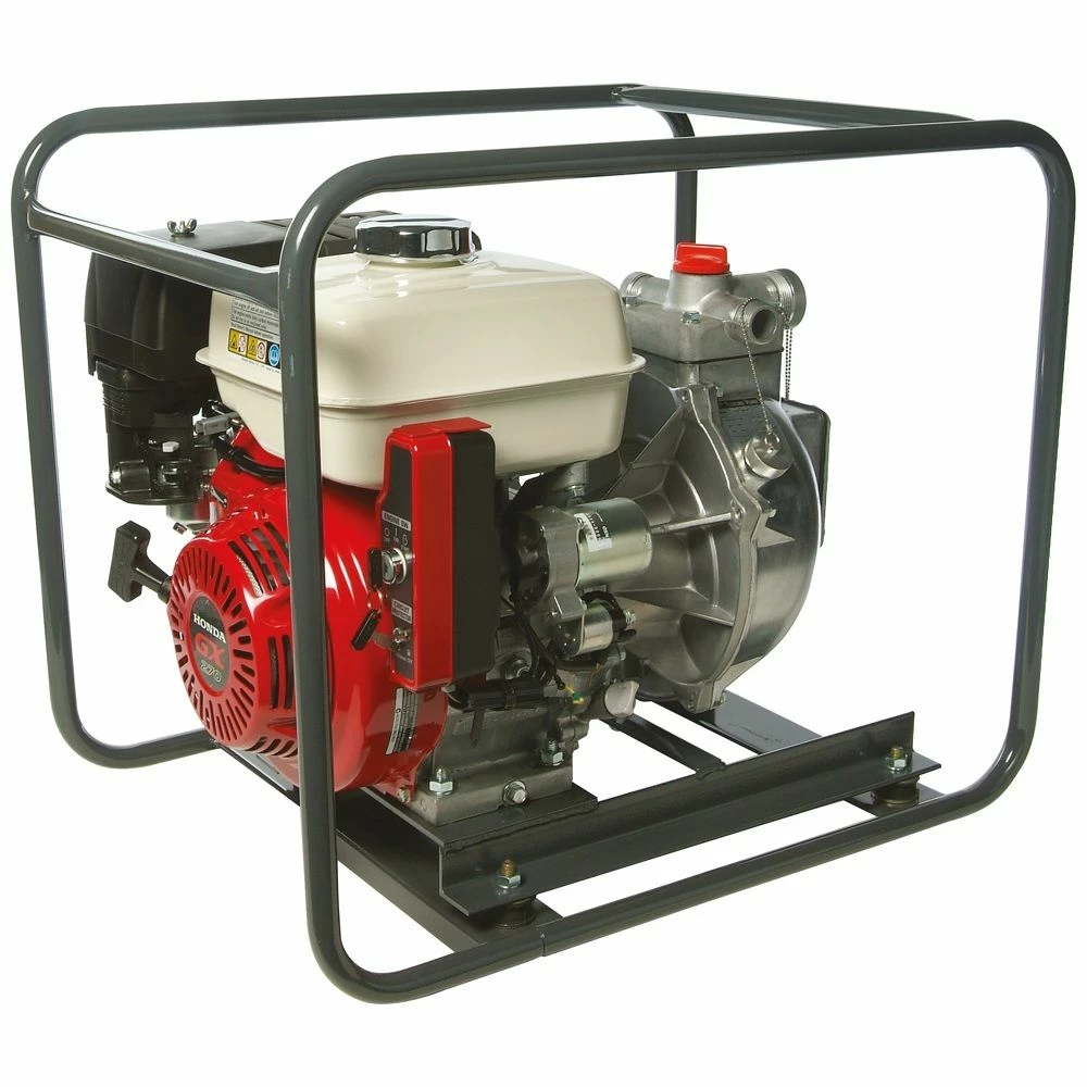 TEW2-50HA pump: Mobile, lightweight self-priming unit, capable of very high pressure. Ideal for fire-fighting and irrigation. Fitted with a three outlets (2 x 1″ & 1 x 1½”) for multi user supply, blanking caps and a easy carry frame. Powered by electric start GXH270 Honda engine (battery not supplied) with oil alert for engine protection. Supplied with hose connectors, strainer and hose clips.